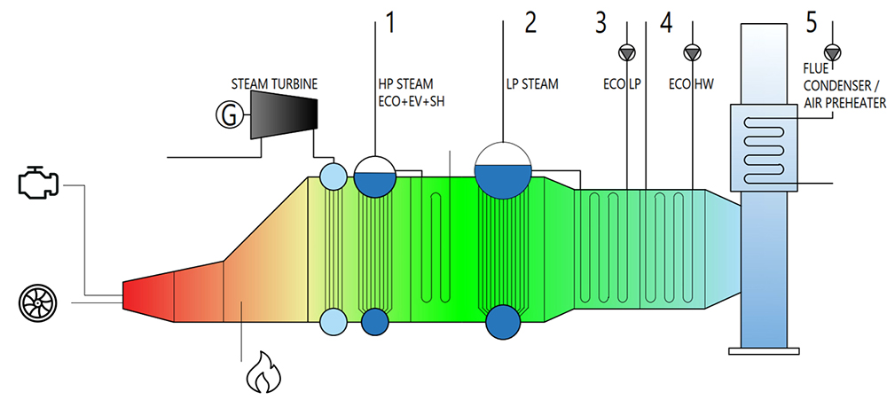 Il layout è pensato per adattarsi alla presenza di diverse fonti di recupero, come turbogas o microturbine, mentre la sezione di combustione entra in funzione nei momenti di picco della richiesta di vapore o in caso di squilibri degli impianti a monte.